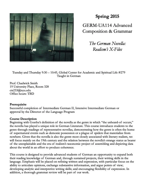 Because literary study is also about finding the seams and joints of writing and language, the experience of teaching language reinforces and improves my effectiveness in all of my classes. I have taught all levels of German language in both intensive and standard settings. I practice a learner-centered, communicative approach that emphasizes interaction and dialog while nevertheless stressing oral and written proficiency and grammatical rigor. Thus I have two basic goals in teaching language. The first and primary goal is to make my students proficient in the German language, which requires pedagogical methods and clear objectives in each course. The second, concomitant goal is to foster enthusiasm for German culture and history that maintains the joy of learning a foreign language. Beginning with the first elementary German classes, literature and other cultural materials provide students with access to the rhythm and sound of German as it is connected to life and thought in the German-speaking world. I hope to transmit to my students not only my knowledge but also my curiosity and enthusiasm for the subject matter.