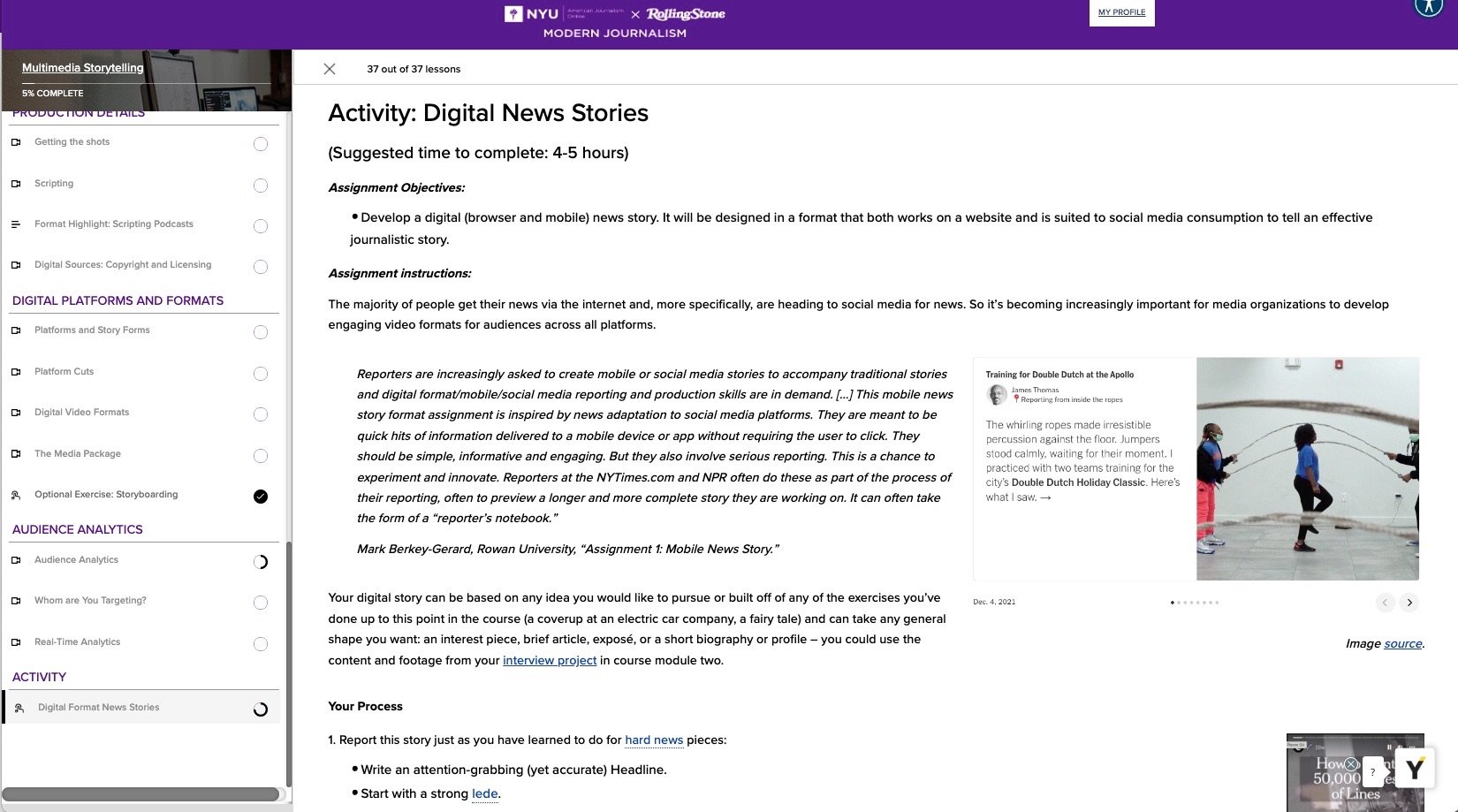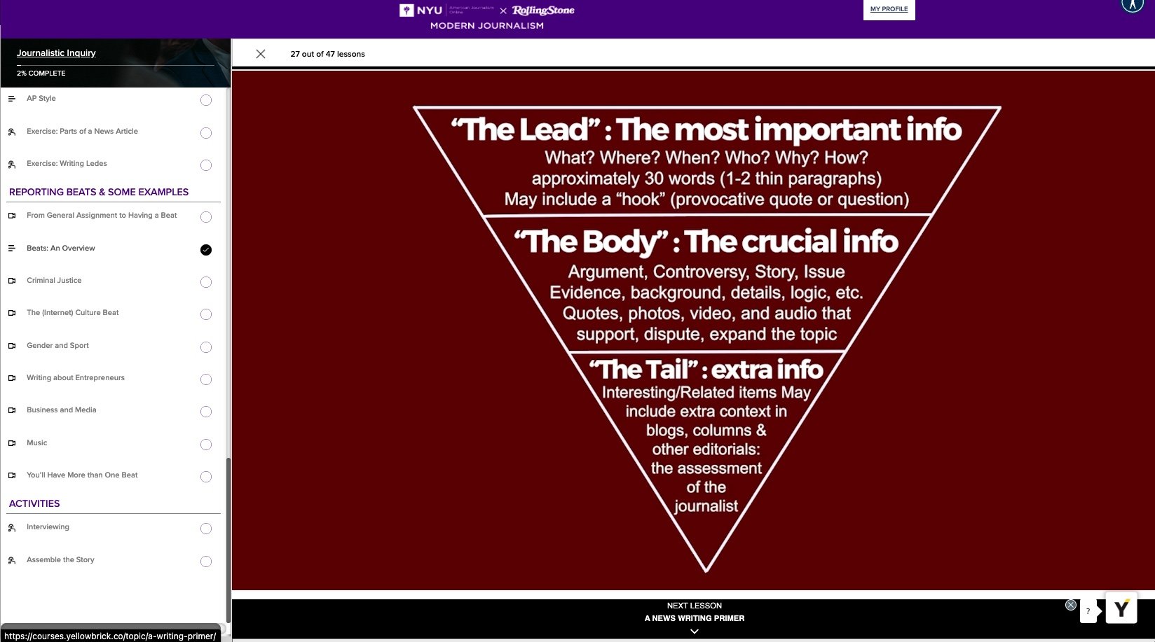 Modern Journalism is an introductory course for individuals interested in learning technical skills required of practitioners of the field of journalism. It provides an understanding of the breadth of the field and the diversity of elements and subfields that constitute it. This course is taught by professional journalists and intended for future colleagues, while accounting for the expanding definition of what journalists cover and how they work.