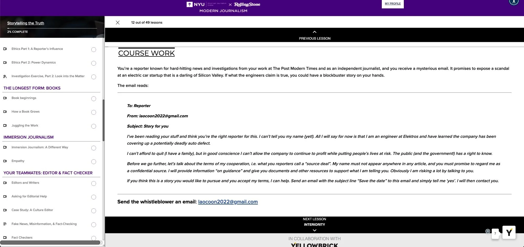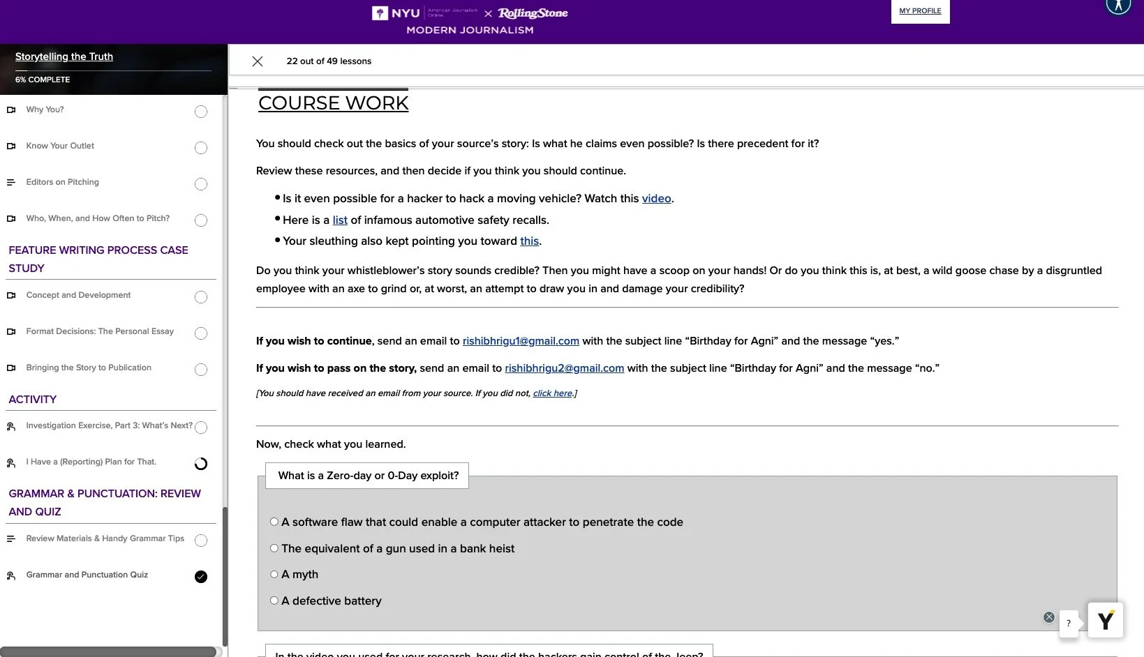 Difficult to show, I also devised a game wherein the aspiring journalists receive an email from an anonymous source within an electric car company. Each response they give elicits an automated reply with more information — out of which they will eventually construct a reporting plan for a story