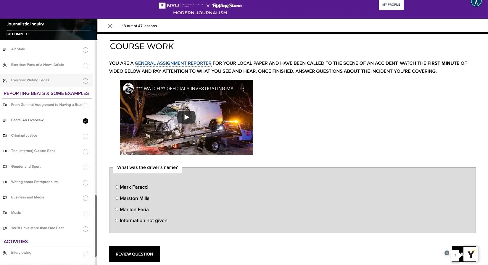 Many basic journalistic skills needed to be practiced, not just quizzed. Throughout the course, I developed exercises like this one, intended to highlight observational skills. The learner watches a one-minute video of Massachusetts Police’s response to a traffic accident, which includes the audio from the emergency radio channel. When finished, they must answer questions about the fact base of the incident.